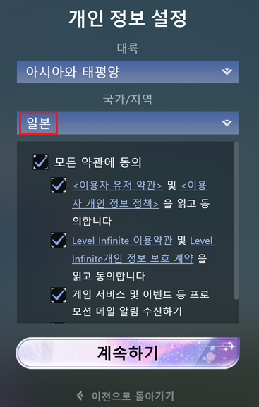 여기서 중요한 점! 국가/지역을 일본을 선택해주세요. 여기서 선택하는 국가/지역은 서버와 무관한 국가/지역이니 일본을 선택한다고 일본 서버로 플레이하는 것이 아닙니다.