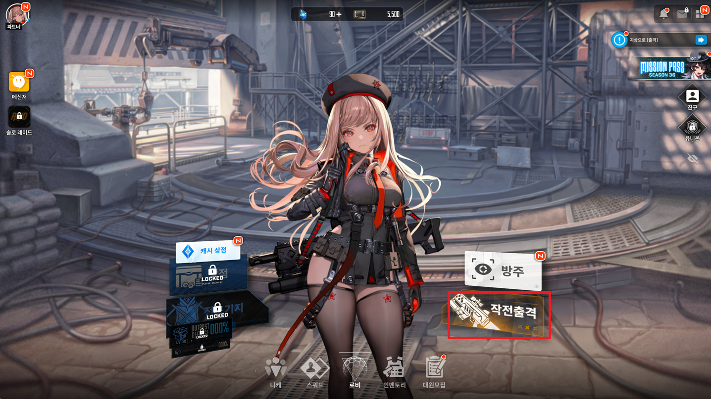 이후 바로 가챠를 하지 않고 작전출격을 클릭합니다. 조금 더 진행하여 재화를 모아서 리세마라 가챠를 진행하기 위함입니다.