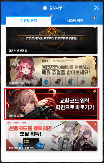 이벤트 공지에서 아래로 스크롤 내리면 교환 코드 입력 배너가 보입니다.