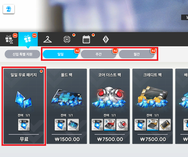 상단 캐시상점 탭을 2번째로 이동하여 일일, 주간, 월간 패키지의 첫번째에 위치한 무료 패키지를 획득해줍니다.
