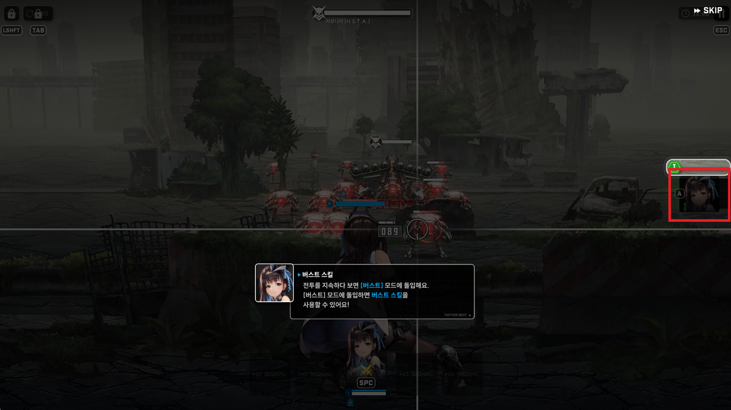 니케 리세마라의 귀찮은 점은 극초반 조작에 오토가 없고 튜토리얼 조작이 많다는 점입니다. 최대한 skip을 눌러주면서 랩처(적)을 에임을 조준하여 처치해줍니다.