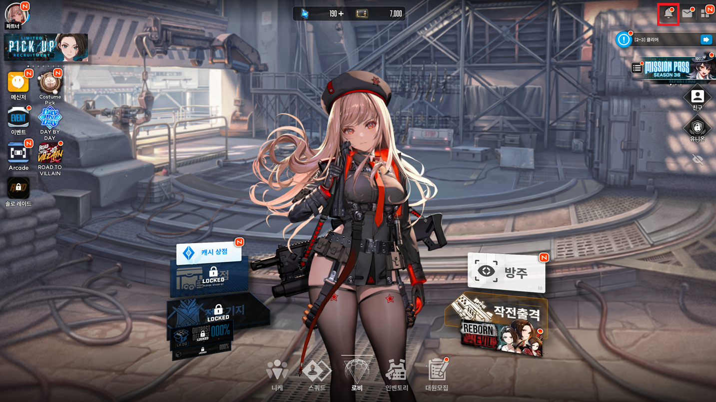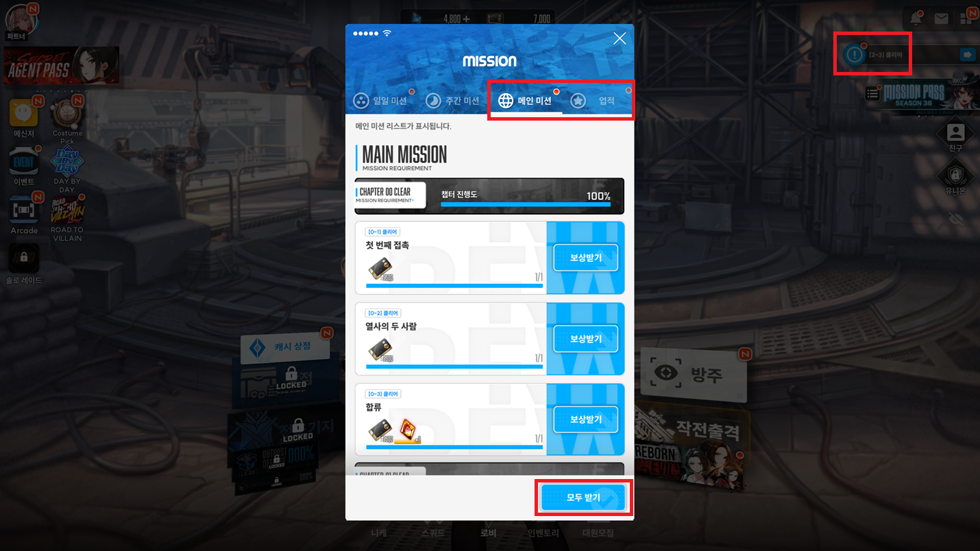 로비에서 우측 상단에 있는 미션을 클릭하여, 메인 미션 및 업적에서 모두 받기를 진행합니다.