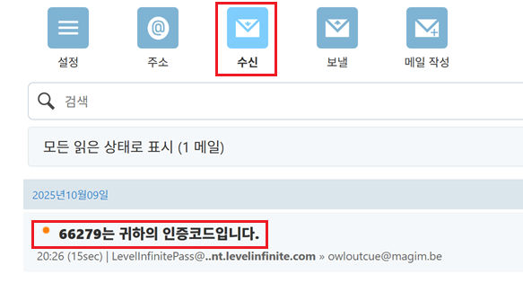 일회용 이메일 생성 사이트에서 수신을 클릭해보면 인증 코드 이메일이 온 것을 확인할 수 있습니다. 해당 인증 코드를 가입 절차에 기입하여 진행해주세요.