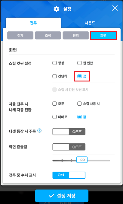 전투 > 화면 설정에 들어가서 스킬 컷씬 설정을 끔으로 설정합니다. 이는 스킬을 사용할 때 빠르게 진행하기 위한 설정입니다.